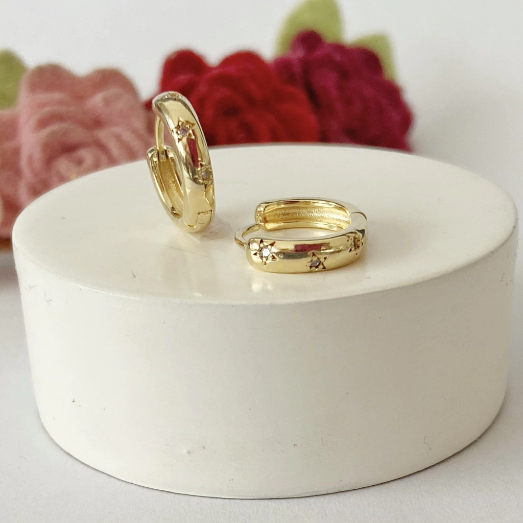 Banhada em ouro e revestida com uma camada exclusiva de verniz antialérgico, com detalhes de estrelinhas em zircônia, este brinco é a escolha perfeita para garantir estilo e conforto ao mesmo tempo.