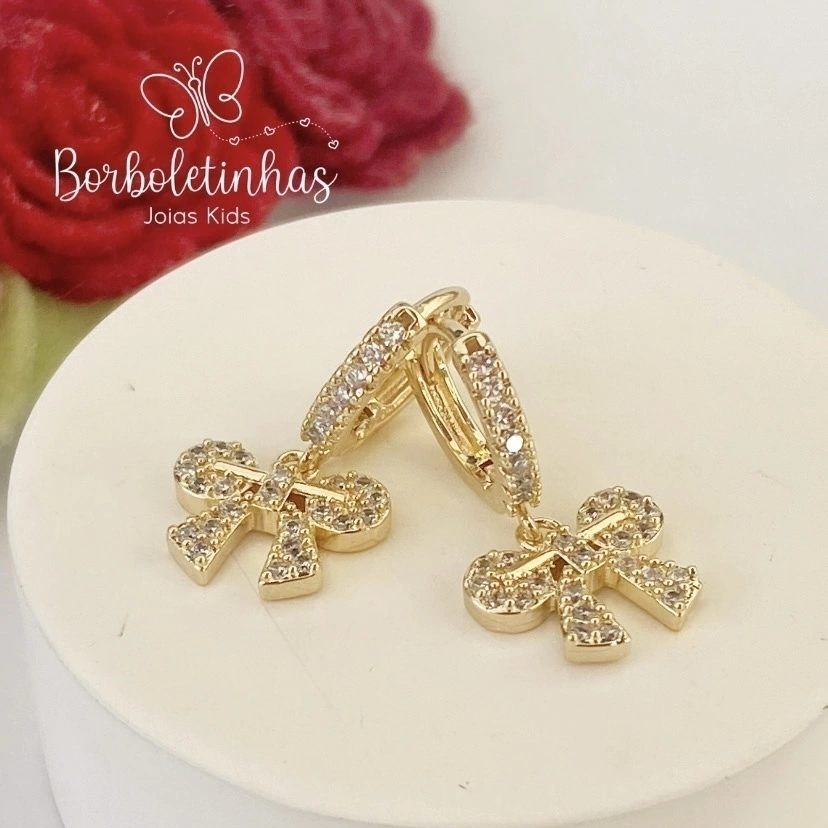 Nossa Argolinha e Banhada a Ouro cravejada com micro zircônias e com pingente em enformato de lacinho também cravejado de zircônias que dão um toque especial a está peça, uma j semijoia com carinha de joia