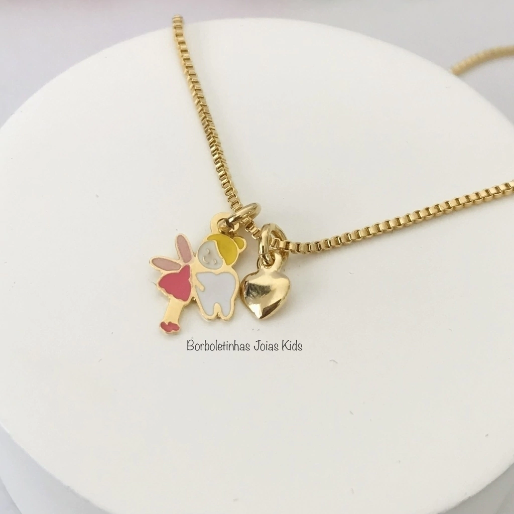 Nossa Colarzinho é Folhada a Ouro 18k e tem um pingente de Fadinha do dente resinada e outro pingente de coração, que dao um toque ainda mais especial ao colar