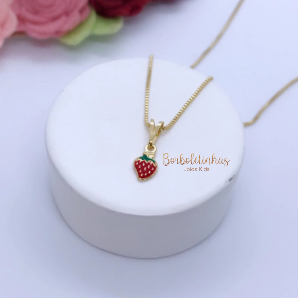 Com um pingente de morango resinado, esta semijoia é banhada em ouro 18k e é antialérgica, garantindo conforto e estilo para quem a usa.