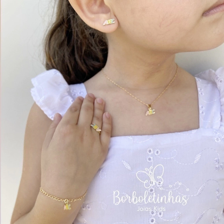 Transforme o visual da sua princesa com o Conjunto ABC! Este conjunto delicado, banhado a ouro, traz um charme especial com detalhes em resina que são a cara da moda.