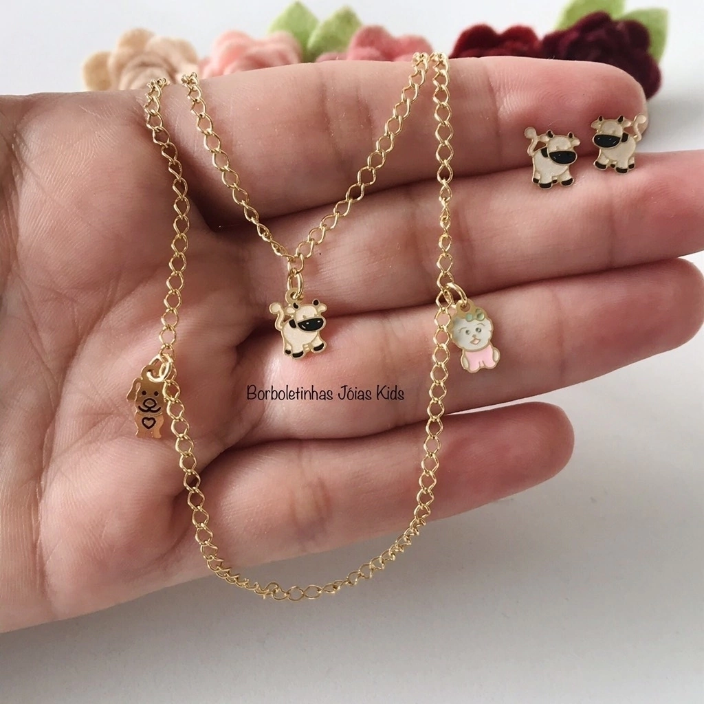 Encante sua princesa com o Conjunto Aminais, uma joia delicada e cheia de charme que combina uma corrente dupla com pingentes adoráveis de animais: cachorro, vaquinha e ursinha. Perfeito para meninas acima de 3 anos, este conjunto traz um toque de fofura e elegância ao visual infantil.